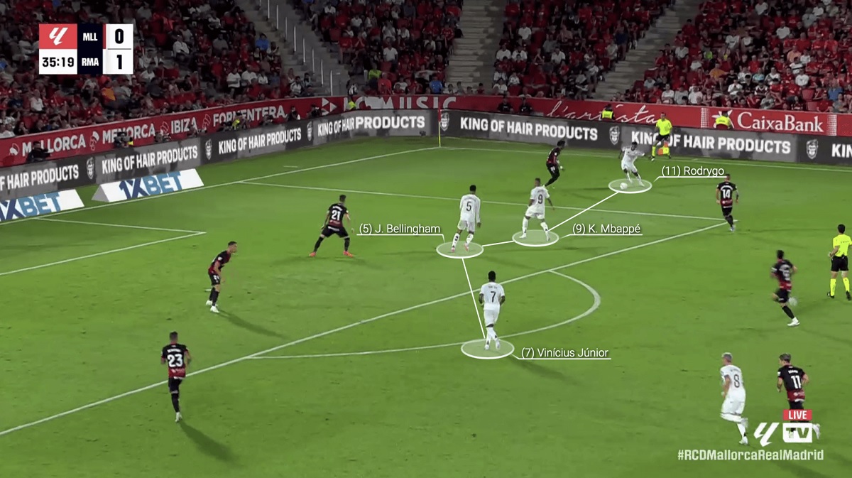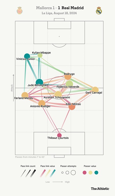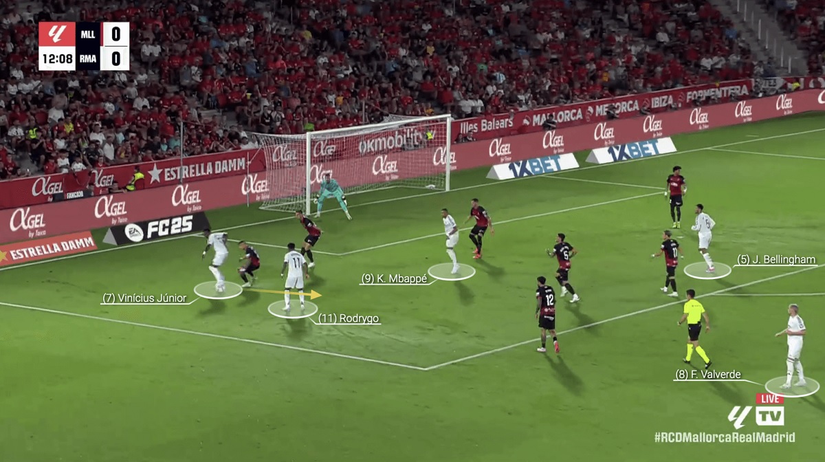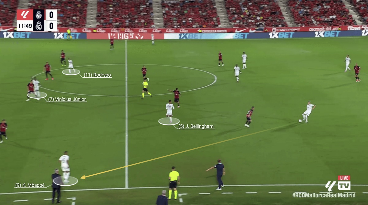 В стартовом матче «Мадрида» между Беллингемом и атакующей тройкой было сделано 83 передачи, 51 из которых пришлась на финальную треть, а шесть привели к ударам по воротам. Многие из этих комбинаций проходили слева, где Мбаппе и Родриго поочередно смещались и образовывали разрушительные треугольники с Винисиусом, чтобы перегрузить защитника.