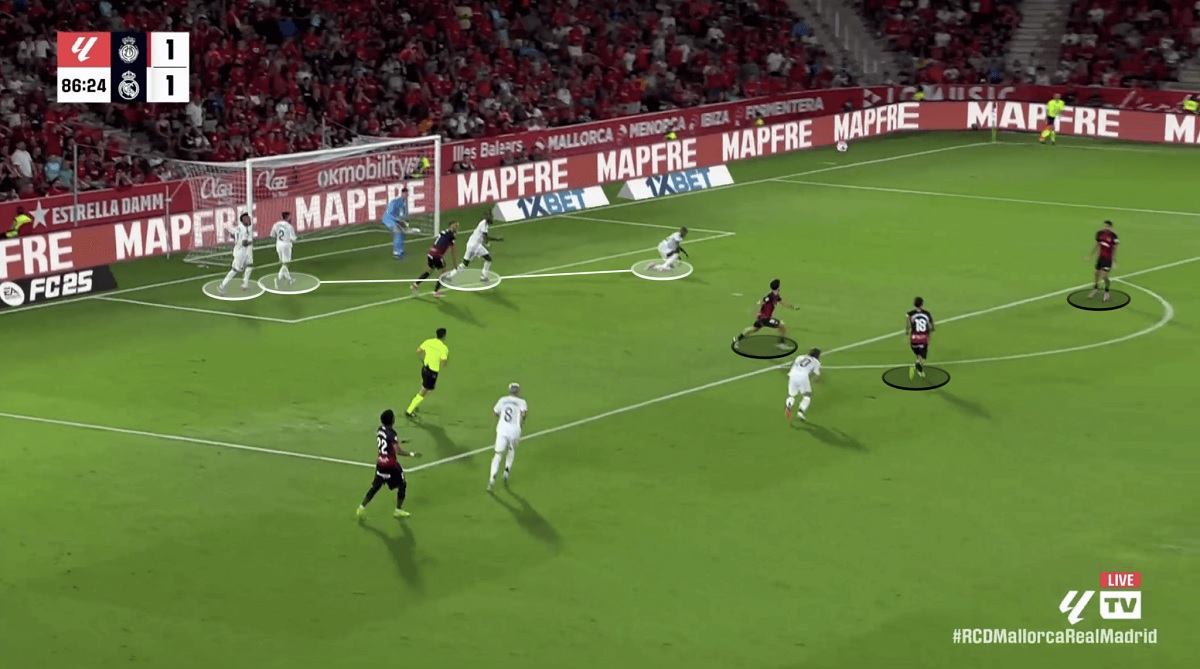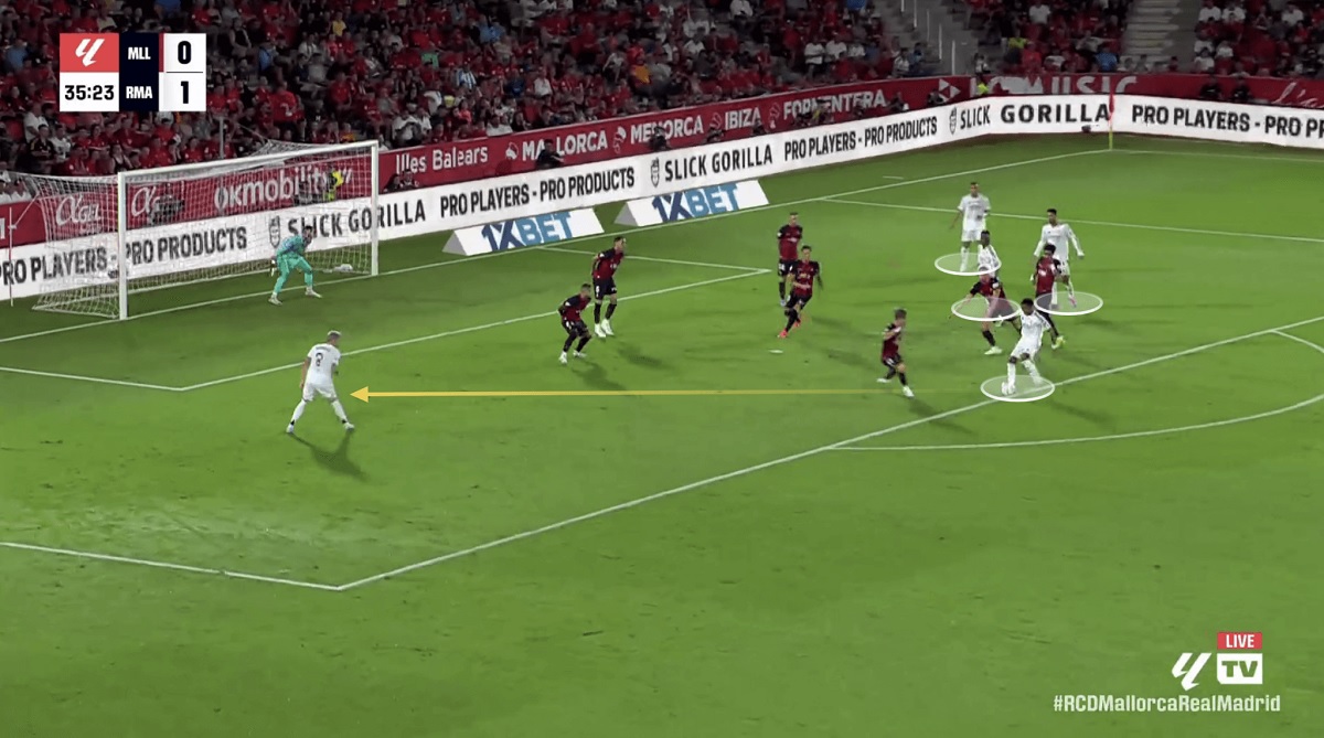 Качество передачи Рюдигера заставляет оборону «Мальорки» отступить назад, позволяя Родриго прорваться внутрь и атаковать.