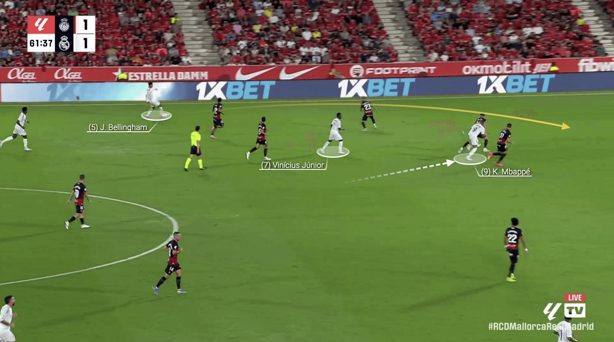 Беллингем на скорости уводит защитника от Мбаппе и создает ситуацию «два-в-одного», позволяя партнерам в четыре передачи войти в штрафную. В то же время партнеры по атаке объединяются, создавая перегруз в левой части поля.