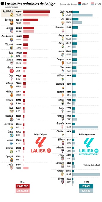 Клубом, который может потратить больше всего на свой состав, по-прежнему остается «Реал Мадрид» с лимитом в 754 млн по сравнению с 727 млн на рынке прошлой зимой. На третьей строчке идет «Атлетико». Лимит «красно-белых» составляет 310 млн, хотя зимой они могли потратить только 215 млн.
