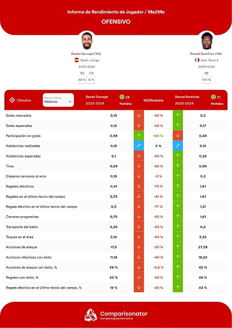 Правда в том, что в миланском «Интере» он действует скорее как нападающий, чем как чистый защитник, но он умеет играть и на этой позиции. Дюмфрис также отличается по своему профилю от Карвахаля. Он придерживается более физического и прямого подхода. Его стиль игры более агрессивен, что может быть полезно в ситуациях, когда необходим футболист, способный оказывать давление на соперника и генерировать ситуации для контратак.