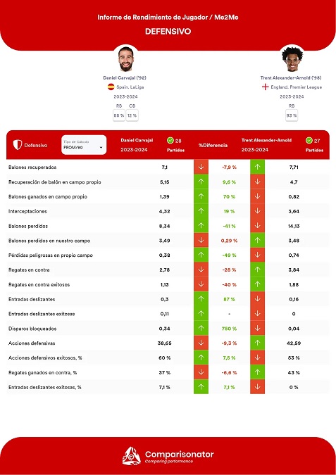 Низкое количество совершенных фолов (0,31) и способность избегать предупреждений (0,23 полученных желтых карточек) позволяют предположить, что Трент больше сосредоточен на построении игры, чем на единоборствах. Это делает его латералем, который может отдавать ассисты и создавать опасные моменты, однако он может быть более уязвимым в защите по сравнению с Карвахалем.