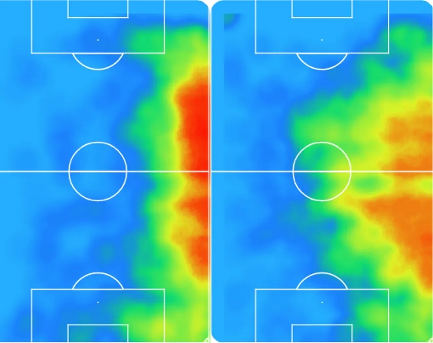 Если посмотреть на зону передвижения Карвахаля (левая картинка) и сравнить с Трентом (правая), то видно, что они придерживаются разного стиля игры. Конечно, многое зависит от требований тренера, но испанец больше действует по длине, а англичанин смещается в центр поля, участвует в построении игры и может решать исход атаки.