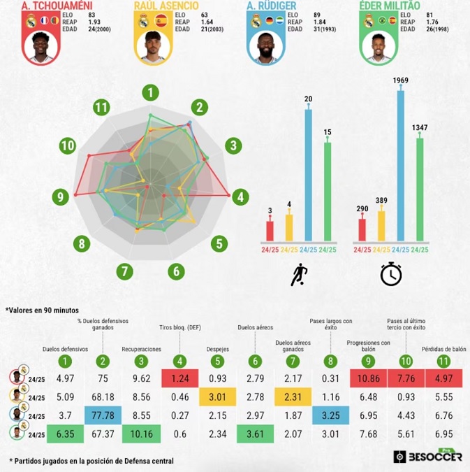 Показатели Чуамени в опорной зоне не впечатляют, и, что интересно, больше всего он блистает в роли центрального защитника. В этом сезоне в трех матчах на позиции центрального защитника у него лучшие показатели по успешным передачам в финальную треть (7,8 за 90 минут), движению мяча (10,9) и блокам (1,2). По количеству оборонительных дуэлей он сравнялся с Рюдигером (5 за матч с 75% успеха, у немца 5,1 и 77,8%), а в отборе мяча он опережает как Рюдигера, так и Асенсио (8,5 у обоих, у Орельена 9,6) и преследует Милитао (10,2). «Он может разозлиться, но он впечатляющий центральный защитник. Он отлично играет, разыгрывает мяч, как мало кто другой, и тактически он в полном порядке», – шутил Анчелотти год назад. Но, как известно, в каждой шутке есть доля правды.