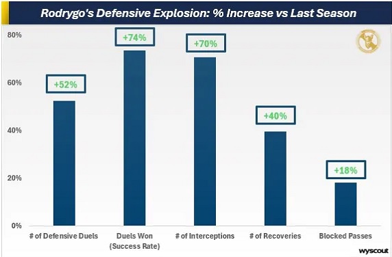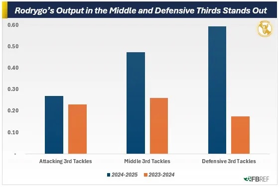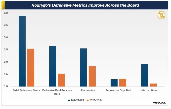 Если посмотреть на данные внимательнее, то окажется, что показатели Родриго в атакующей трети схожи с прошлым сезоном. Настоящий скачок произошел в средней трети и, что еще более важно, в обороне.