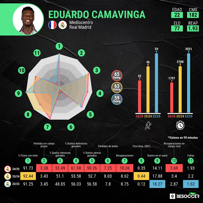 Его личное возвращение на «Метрополитано» не увенчалось успехом. Сезон Камавинги идет не по плану. Особенно это стало очевидно после его игры против «Арсенала», когда он сыграл неудачно и способствовал общей катастрофе команды в Лондоне. Его сезон начал рушиться в финале Суперкубка в Джидде, тогда он совершил тот фол, приведший к пенальти на Гави, и на данный момент нет ничего, что могло бы его исправить. На «Эмирейтс» он достиг негативного перелома, снова опрометчиво сфолив (в результате «спасительного» фола на Томасе Парти счет стал 0-2 благодаря Деклану Райсу). Дежавю с Камой: его худший проступок и худший день.
