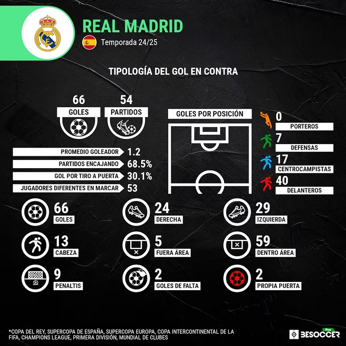 В 2025 году «Реал Мадрид» лишь пять раз из 28 матчей сумел сохранить ворота «на замке» (17,85%). «Сухие» матчи были: против «Депортиво Минера» в Кубке (5-0), против «Мальорки» в Суперкубке (3-0), против «Вальядолида» (3-0), против «Жироны» (2-0 – единственный домашний матч, где не пропустили), и против «Алавеса» (1-0), а также в Лиге Чемпионов против «Бреста» (3-0).