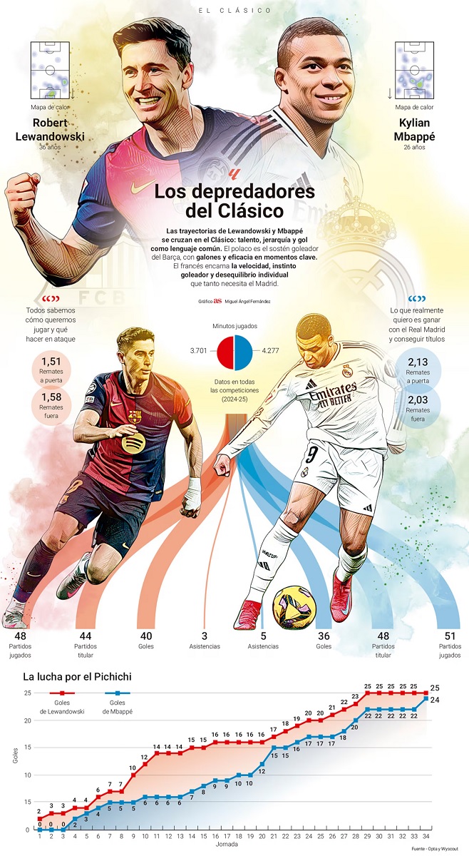 Левандовски и Мбаппе стали главными источниками голов для своих команд благодаря своему мастерству и статусу, хотя с небольшими различиями. 25 голов Левандовски составляют 27,5% от общего числа голов «Барселоны», в то время как 24 гола Мбаппе составляют 34,8% от голов «Мадрида».