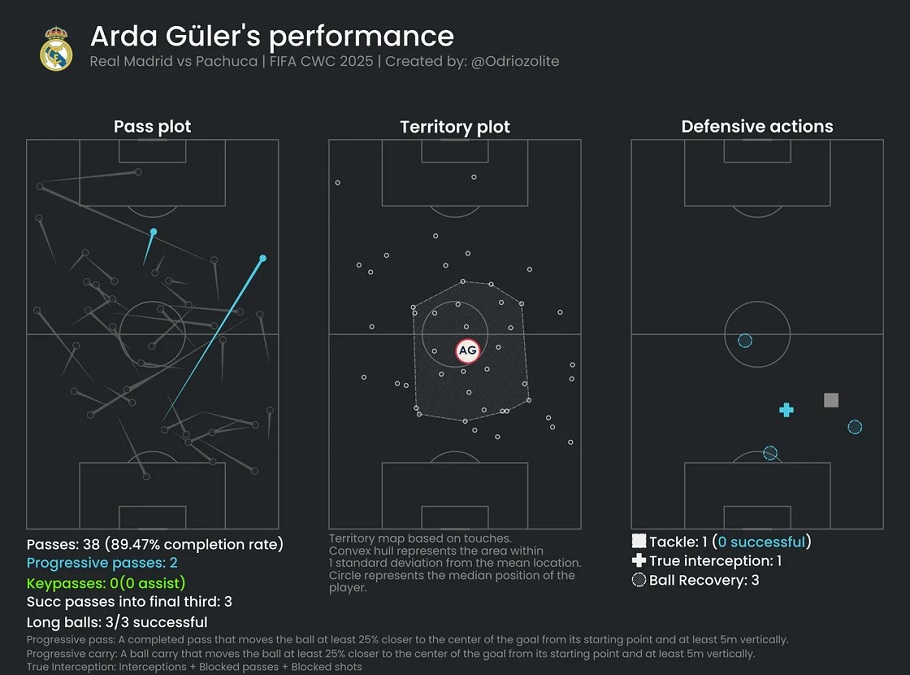 Его перемещения, стремление к комбинационной игре и продвижению мяча из глубины выглядели очень остро. Уже в первом матче против «Аль Хиляля» влияние Гюлера было заметно – он вышел на замену и начал раздавать разрезающие передачи, помогая «Мадриду» создавать угрозу через длительное владение мячом. Его умение находить передачи в, казалось бы, несуществующих коридорах делает его эффективным инструментом против плотной обороны.