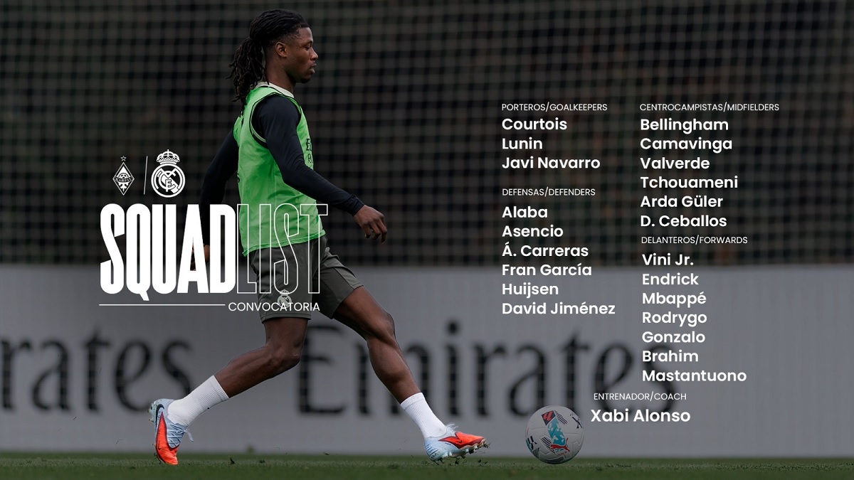В заявку мадридского «Реала» на матч 2-го тура общего раунда Лиги Чемпионов против «Кайрата» по решению тренерского штаба Хаби Алонсо вошли 22 футболиста. Из-за проблем в обороне в состав вошел защитник кантеры Давид Хименес. Не сыграют травмированные Ферлан Менди, Трент Александер-Арнольд и Антонио Рюдигер, а также Дани Карвахаль (дисквалифицирован) и, получивший повреждение в дерби, Эдер Милитао.