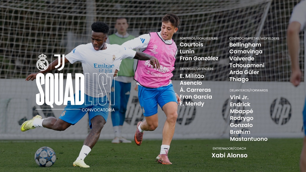 В заявку мадридского «Реала» на домашний матч 3-го тура общего раунда Лиги Чемпионов против «Ювентуса» по решению тренерского штаба Хаби Алонсо вошел 21 футболист. В состав вернулся восстановившийся от травмы Ферлан Менди. Не смогут помочь команде травмированные Дани Карвахаль, Трент Александер-Арнольд, Антонио Рюдигер, Дин Хёйсен и Дани Себальос, а также получивший повреждение Дэвид Алаба.
