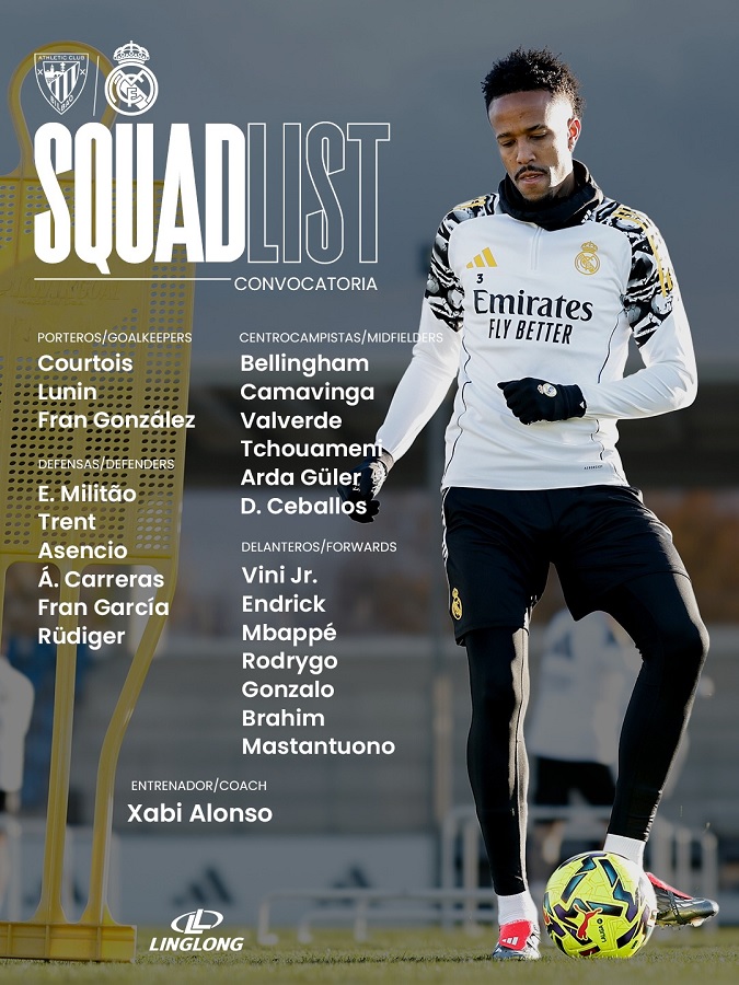 В заявку мадридского «Реала» на выездной перенесенный матч против «Атлетика» из Бильбао в рамках 19-го тура Ла Лиги по решению тренерского штаба Хаби Алонсо вошли 22 футболиста. В состав вернулся Рауль Асенсио. Не сыграют травмированные Дани Карвахаль, Дэвид Алаба, Дин Хёйсен и Ферлан Менди.