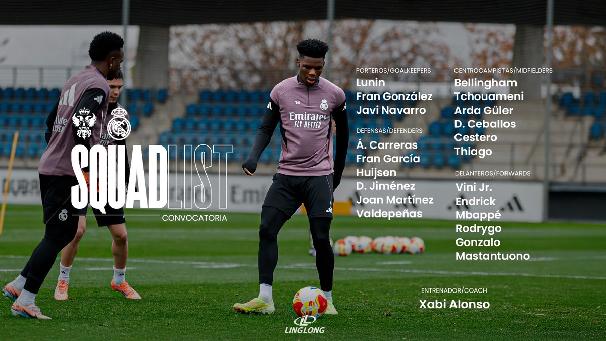 В заявку мадридского «Реала» на выездной матч 1/16 финала Кубка Короля против «Талаверы» по решению тренерского штаба Хаби Алонсо вошел 21 футболист, включая Килиана Мбаппе, Альваро Каррераса, Франа Гарсию и Эндрика. В заявку также попали игроки кантеры Давид Хименес, Жоан Мартинес, Виктор Вальдепеньяс, Хорхе Сестеро и Тьяго Питарч. Помимо травмированных Дани Карвахаля, Эдера Милитао, Дэвида Алабы, Трента Александер-Арнольда, Ферлана Менди и Эдуардо Камавинги, по решению тренера пропустят матч Тибо Куртуа, Антонио Рюдигер, Рауль Асенсио, Федерико Вальверде; а также вызванный на Кубок Африки Браим Диас.