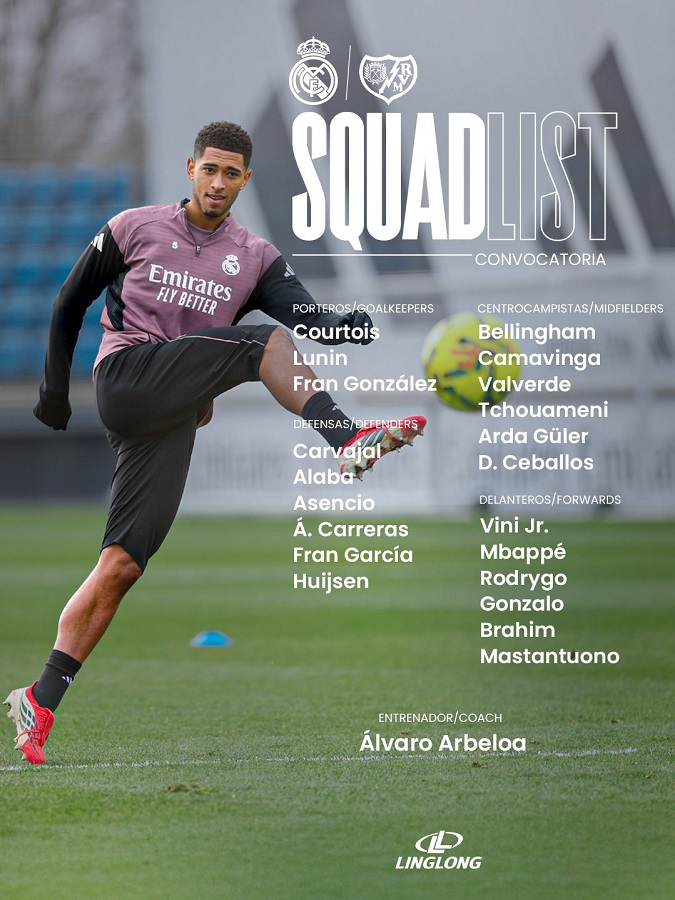 В заявку мадридского «Реала» на матч против «Райо Вальекано» в рамках 22-го тура Ла Лиги по решению тренерского штаба Альваро Арбелоа вошел 21 футболист. По-прежнему вне игры остаются травмированные и не до конца готовые Эдер Милитао, Трент Александер-Арнольд, Антонио Рюдигер и Ферлан Менди.