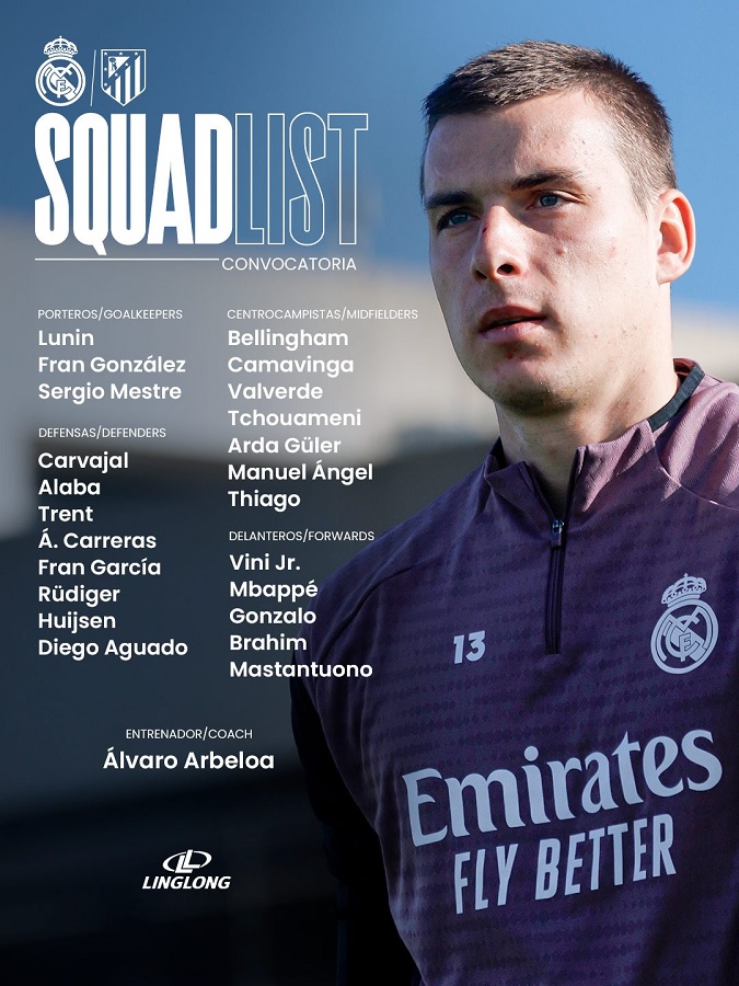 В заявку мадридского «Реала» на мадридское дерби против «Атлетико» в рамках 29-го тура Ла Лиги по решению тренерского штаба Альваро Арбелоа вошли 23 футболиста. Помимо игроков первой команды, в состав попали игроки кантеры Диего Агуадо, Мануэль Анхель и Тьяго Питарч. Точно не сыграют травмированные Тибо Куртуа, Эдер Милитао, Дани Себальос, Родриго Гоэс, Ферлан Менди и Рауль Асенсио.