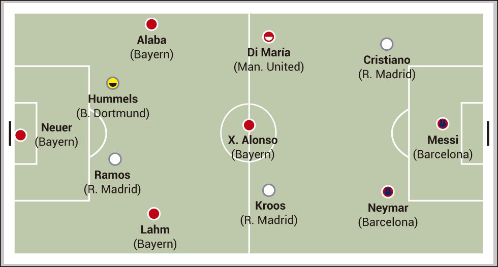 Мануэль Нойер («Бавария») – Филипп Лам («Бавария»), Серхио Рамос («Реал»), Матс Хуммельс («Боруссия Дортмунд»), Давид Алаба («Бавария») – Тони Кроос («Реал»), Анхель Ди Мария («Манчестер Юнайтед»), Хаби Алонсо («Бавария») – Лео Месси («Барселона»), Криштиану Роналду («Реал»), Неймар («Барселона»)