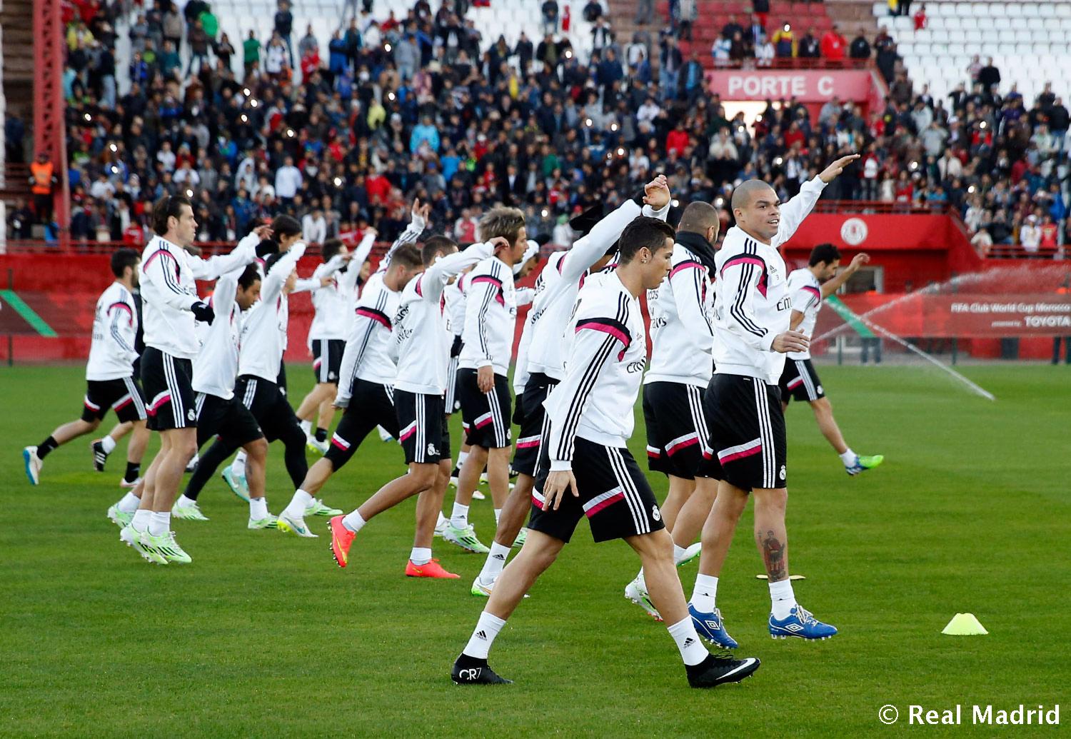 Вчера по приезде в столицу Марокко мадридский «Реал» провел на стадионе имени Принца Мулая Абдулы последнюю подготовку к полуфинальному матчу Клубного Мундиаля. Тренировка проходила перед тысячной аудиторией, внимательно наблюдавшей за действиями футболистов.