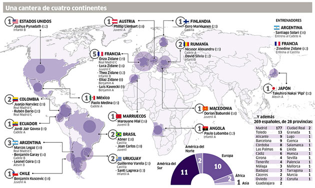 Спортивный городок мадридского «Реала» Вальдебебас давно перестал быть чисто мадридским или даже чисто испанским феноменом. Сегодня здесь занимаются молодые ребята из 17 разных стран. Географический охват поражает: от Японии до Анголы, от Мексики до Финляндии.