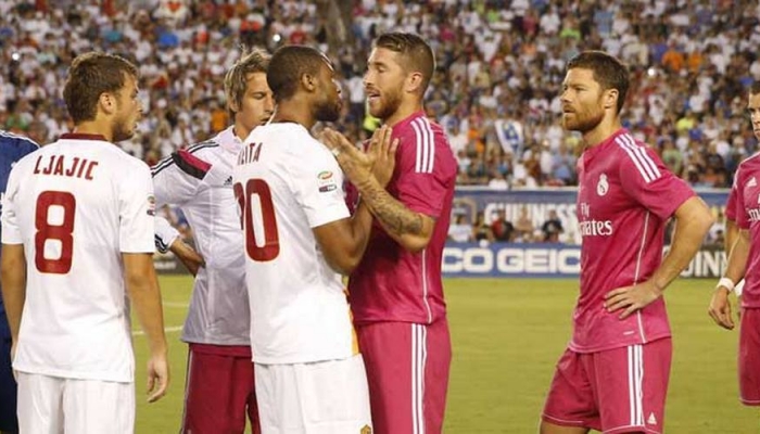 Товарищеский матч между «Реалом» и «Ромой» получился богатым на события – страсти закипели буквально с первых минут после появления команд на поле: во время традиционного предматчевого рукопожатия между полузащитником итальянской команды Сейду Кейта и Пепе завязался конфликт, вспыхнувший из-за старой вражды между игроками. Бывший игрок «Барселоны» отказался приветствовать центрального защитника «Реала», а потом, когда на поле завязалась словесная перепалка, швырнул в него бутылку с водой, попав в левое плечо португальца.