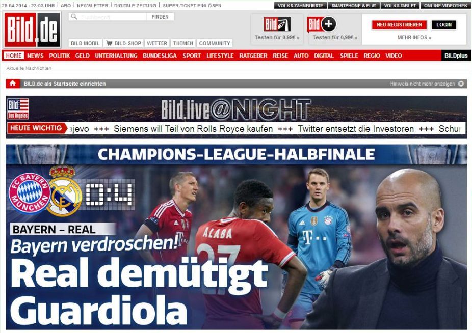 Мировые СМИ бурно отреагировали на разгром «Баварии» в Мюнхене, устроенный мадридским «Реалом». Немецкая пресса не пожалела критических стрел в адрес Хосепа Гвардиолы, отметив его тактические ошибки и полную беспомощность на скамейке запасных. Примечательно, что часто несправедливые по отношению к «Реалу» барселонские Sport и Mundo Deportivo в этот раз высоко оценили игру подопечных Карло Анчелотти.