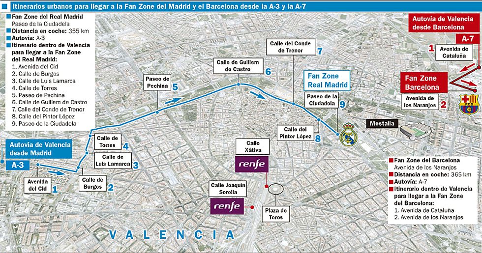 Фан-зоны обеих команд будут организованы в том же самом месте, что и три года назад: мадридисты будут находиться в высохшем русле реки Туриа (от моста Пейнета до бульвара Аламеда), а фан-зона болельщиков каталонского клуба будет расположена напротив Политехнического Университета напротив въезда в город со стороны Барселоны. Обе зоны находятся в десяти минутах ходьбы от «Местальи» и будут работать 16 апреля с самого утра.