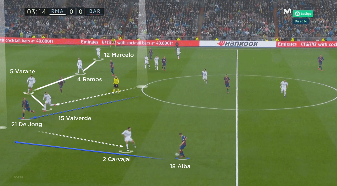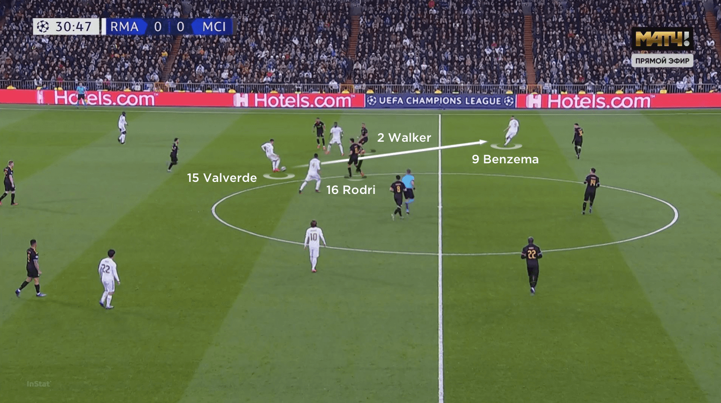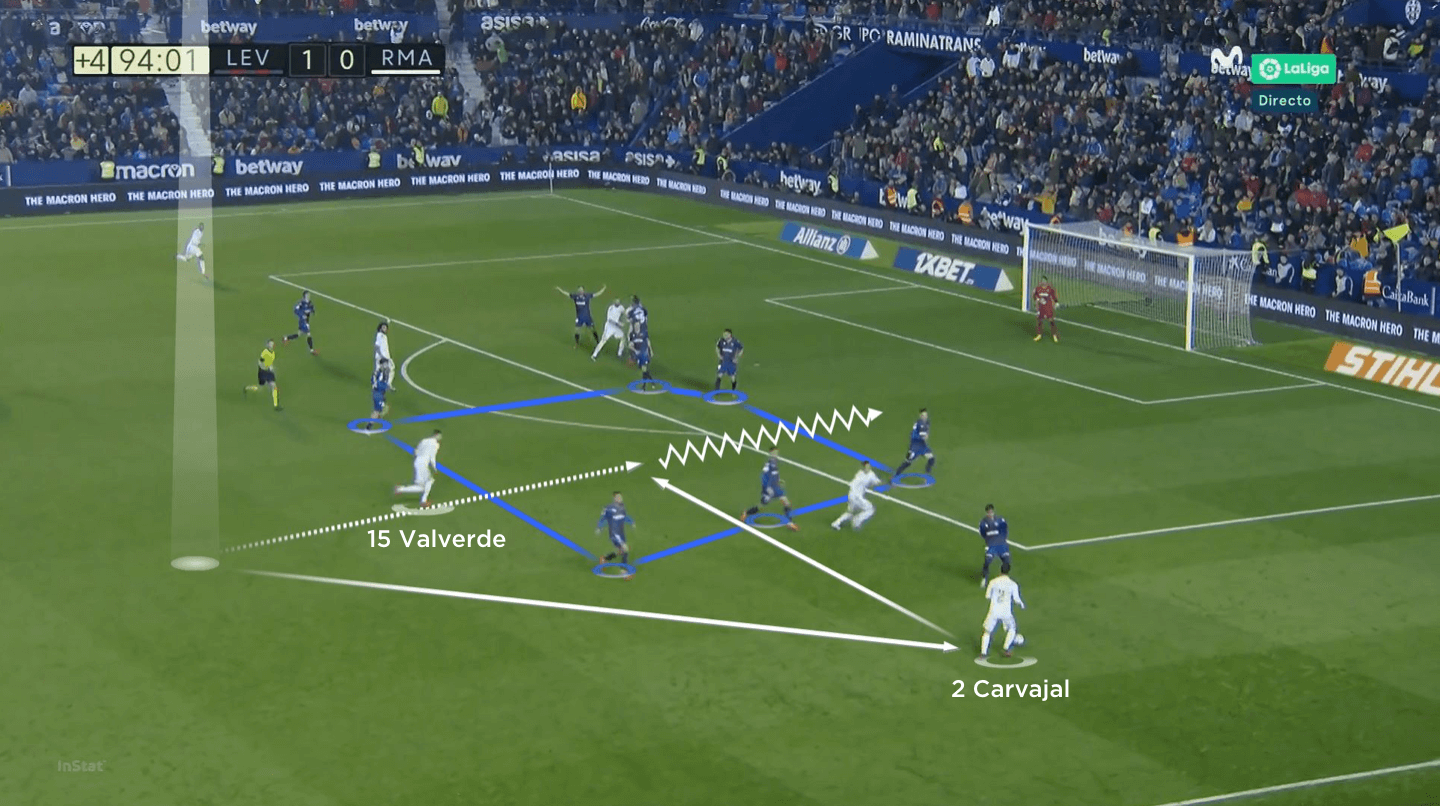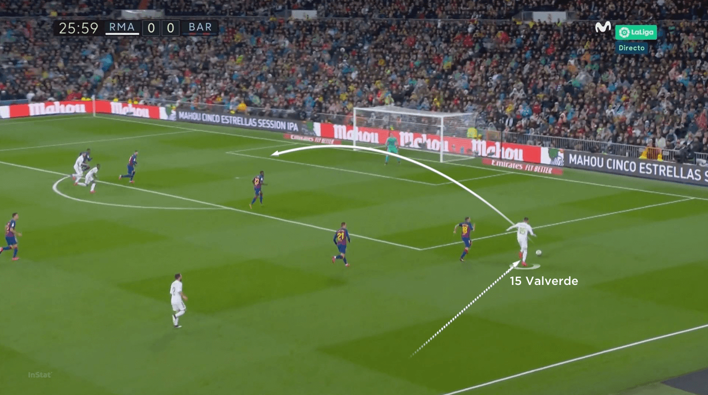 Важно отметить, что Федерико постоянно сохраняет высокий уровень концентрации и играет важную роль в подстраховке Дани Карвахаля во время его частых подключениях по правому флангу: Вальверде занимает позицию, которую покидает Карвахаль, и делает это довольно самоотверженно и охотно.